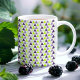 Diese farbenfrohe Tasse zeichnet sich durch ein niedliches geometrisches Muster aus, das aus drei Seiten in Kalkgrün und lila Farbtönen besteht.