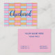 Die farbenfrohe Visitenkarte des kontrollierten Musters wurde von Nisha Prabhu entworfen. Vollständig anpassbar. Personalisieren Sie Ihre Daten. Diese farbenprächtige Checkered Pattern Business Card ist eine einzigartige und auffällige Möglichkeit, eine Aussage mit Ihren Kontaktinformationen zu machen. Die Vorderseite der Visitenkarte weist ein schönes kariertes Muster in verschiedenen hellen Farben auf, das ein kühnes und spielerisches Design schafft. Auf der Rückseite der Karte können Sie sie mit Ihrem Namen, Titel, Kontaktdaten und anderen relevanten Informationen anpassen. Ob Sie an Netzwerkveranstaltungen teilnehmen, Kunden treffen oder einfach Kontaktinformationen austauschen, diese farbenfrohe Checkered Pattern Business Card verlasse Ihnen einen bleibenden Eindruck und zeigt Ihre kreative und wunderschöne Persönlichkeit.