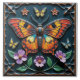 Ein farbenfroher Schmetterling mit orangen und gelben Flügeln, umgeben von Blume und kleineren Schmetterlingen, Set vor einem dunkelblauen Hintergrund innerhalb eines verzierten quadratischen Rahmens.
