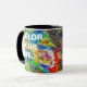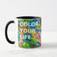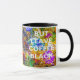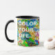 Makroansicht einer Farbpalette mit einer Mischung aus Ölfarbe verschiedener Farben. Helle und farbenfrohe abstrakte Malerei ist diese Palette, wie sie ist. Nur ein Regenbogen mit farbiger Ölfarbe. - In unserem Leben gibt es eine Single-Farbe, wie auf der Palette eines Künstlers, die den Sinn von Leben und Kunst liefert. Es ist die Farbe der Liebe. (Marc Chagall). Funny anpassbare Kaffee-Tasse. Sie können zwei Vorlagentexte ändern oder löschen: Farbe Ihres Lebens.. und aber verlass Kaffee schwarz.