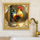 Tile featuring a painting of a rooster framed by a classic design in gold. Beautiful for a farmhouse style or kitchen.