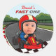 Fast ONE Custom Race CarZoom into birthday fun with this adorable Fast ONE Custom Round Sticker! Featuring your child driving a race car, wearing a helmet, and crossing the checkered finish line, this design includes bold red and checkered “Fast ONE” lettering and two racing flags for extra flair.
