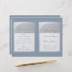 Un élégant programme de mariage plié avec fausse feuille d'argent et bleu poussiéreux, une couleur très moderne. Sur l'avant, il y a des arcs blancs sur faux argentés contenant le texte, sur l'arrière, le texte est en rectangles blancs avec des bordures d'argent. L'arrière - plan est bleu poussiéreux, tout comme le texte. Les titres et les noms de la mariée et du marié sont écrits dans un élégant script calligraphique, le reste en casquette. Pour le Mariage à l'arrière, l'équipe de mariée et l'équipe de mariés sont sur des colonnes séparées.