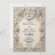 This design utilizes a digital trompe-l'œil technique to simulate the look of high-relief classical masonry. The layout centers on two swans curving their necks to form a heart shape, rendered in a simulated cream-colored stone texture with digital shadowing to suggest depth and weight. The central motif is framed by swirling acanthus leaves and scrolling architectural elements, interspersed with blooming soft pink roses and tulips with muted sage green foliage. The typography combines a formal serif font for the names with an elegant, flowing calligraphy script for the hosting details, all set against a clean off-white background to maximize readability.