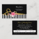Un rendez-vous tendance à rayures noires et blanches rappelle carte de visite pour un salon de coiffure avec une paire d'élégants ciseaux de coupe de cheveux en faux or, agrémenté d'une floraison de belles fleurs roses et or. Personnalisez ce magnifique design de cheveux et de beauté en ajoutant le nom de la coiffeuse, les heures de salon et les informations de rappel de rendez-vous. Image imprimée plate, pas de feuille d'or.