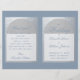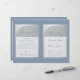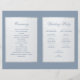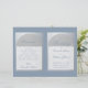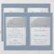 Un élégant programme de mariage plié avec un faux papier d'argent et un bleu poussiéreux, une couleur très moderne. Sur le devant, il y a des arcs en blanc sur faux argent contenant le texte, au dos, le texte est dans des rectangles blancs avec des bordures argentées. Le fond est bleu poussiéreux, tout comme le texte. Les titres et les noms des mariés sont écrits dans un élégant script calligraphique, le reste en majuscules. Pour la fête de mariage au dos, l'équipe de la mariée et celle du marié sont sur des colonnes séparées.