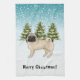 Desteis originelle Cartoon-Illustration eines bezaubernden Mops mit Fellfarbe Hund züchten. Der Hund ist in einer Winterlandschaft mit drei grünen Tannenbäumen und fallendem Schnee untergebracht. Der Hintergrund ist ein blaues bis weißes Gefälle, das das Design des kalten Wintertages verleiht. Es gibt auch einen personalisierbaren Textbereich, der jetzt lautet: "Frohe Weihnachten!".