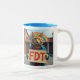 FDT Tasse mit einer coolen Tabbattacke mit einer Retro-blauen Jean-Jacke und einem Regenbogen hinter ihm. Gutes Geschenk für einen FDT- oder LGBTQ-Freund. Reiche knusprige Farben und Design. Das ist eine meiner eigenen KI-Kreationen.