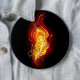 Helle Pfauenfeder aus Feuer und Flamme auf schwarzem Hintergrund.