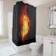 Helle Pfauenfeder aus Feuer und Flamme auf schwarzem Hintergrund.