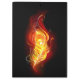 Helle Pfauenfeder aus Feuer und Flamme auf schwarzem Hintergrund.