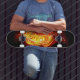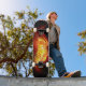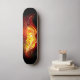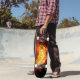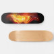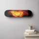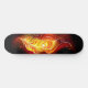 Helle Pfauenfeder aus Feuer und Flamme auf schwarzem Hintergrund.