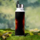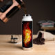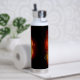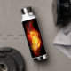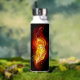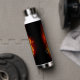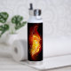 Helle Pfauenfeder aus Feuer und Flamme auf schwarzem Hintergrund.