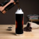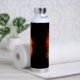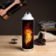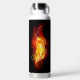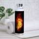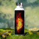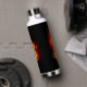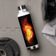 Helle Pfauenfeder aus Feuer und Flamme auf schwarzem Hintergrund.