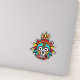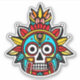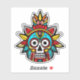 Die Abbildung zeigt eine atemberaubende und lebendige Darstellung eines farbenfrohen Schädels, verziert mit einer faszinierenden Reihe von Federn, die das Bild mit einem Sinn für mystische und kreative Energie befeuern. Der Schädel selbst ist mit einer blendend blühenden Farbpalette von kühlem Blues und Grüntönen bis hin zu warmen Orangen und Rot sehr schön dekoriert und bildet ein Mosaik, das das Leben in der ansonsten lebenslosen Form atmet.