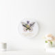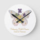 Bringen Sie mit dieser exquisiten Wanduhr eine zeitlose Eleganz und himmlische Schönheit in Ihr Zuhause. Das Design zeigt einen majestätischen Schmetterling mit sanften rosa Aquarellflügeln, die zart mit goldenen Halbmonden und schimmernden Sternen verziert sind. In seiner Mitte zeigt ein handgezeichneter botanischer Blumenstrauß das Veilchen und die Primel, die offiziellen Geburtsblumen für Februar.