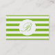 Frühlingsgrüne und weiße Streifen bilden die Hintergrundstreifen mit weißem Kreis oben links. Weißer Monogramm-Brief im Kreis. Text auf der Rückseite in grün - fertig für individuelle Anpassung