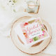 Elegante Hochzeitsnapkins mit "Brautparty" in rosa, modernem Drehbuch mit individuellem, modernen Brautparty für den Namen der Braut. Die Aufnahme ist gerahmt durch einen schicken, wasserfarbenen Blumenstrauß mit pastellrosa, rot, pfirsichfarbenen Frühling und Sommerdahlia und Rose Blume.