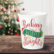 In diesen festlichen Feiertagskuppen ist die Phrase "Baking Spirits Bright" in den Farben Weihnachtsrot, Grün und Gold enthalten. Das Design umfasst eine Weihnachtsmannmütze, heilig mit Beeren, Weihnachtskeksen und Sternexplosion Akzenten.