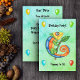 Die Einladung zur Geburtstagsfeier mit einer Fantasy-festlichen Eidechse in hellen Farben, die ein Blatt auf einem Stiel mit verschiedenen farbigen Ballons auf einem grünen und blauen Hintergrund hält. Passen Sie Ihre Daten auf der Vorder- und Rückseite mit den Vorlagen an.