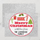 Feierliche Feiertage Frohe Weihnachtskarte mit einem silbernen Glitzer Glitzern Rand und weißem Hintergrund. Die Worte "Frohe Weihnachten" sind in einem fett roten Schrift geschrieben. Die Karte ist mit niedlichen kleinen Illustrationen wie einem Weihnachtsbaum, roten und grünen Bonbons, einem Geschenk und heiligen Blätter geschmückt. Am Ende des Aufklebers befinden sich die Worte "mit Liebe von" und Ihr Familienname.