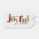 Ein fröhlicher Weihnachtsgeschenk-Tag mit dem Wort "Joyful" in lebhaftem Rot, Grün und Gold, entworfen in einem spielerischen Stil. Dieses festliche Tag ist elegant einfach und bietet Platz für Sie, um den Namen des Empfängers und Ihren eigenen zu schreiben.