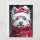Dieses bezaubernde West Highland White Terrier ist bereit für den Urlaub! Dieses kleine Jungtier besticht durch seine gemütliche Weihnachtsmannmütze und seine rote Wintermantel. Mit sanften Schneebauungen in Fell und Mantel ist dieser Winterwunderlandmoment voll von Wärme und Charme. Die ausdrucksstarken Augen und Knopfnase des Westie tragen dieser Urlaubsszene eine zusätzliche Schicht von Schnittheit bei.