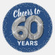 Elegante Sticker zum sechzigsten Geburtstag mit einem trendigen blauen Hintergrund, der in jede Farbe verändert werden kann, silberner funkelnd Glitzer, und das Sprichwort "jubelt bis 60 Jahre" mit sechzig silbernen Helliumballons.