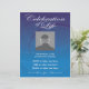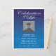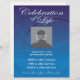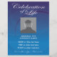 Custom Foto Gedenkfeier des Lebens Einladung Flyer auf wunderschönen blauen Hintergrund mit schwindenden Kreisen. Vollständig anpassbar mit Datum, Uhrzeit, Ort usw. Ersetzen Sie die Vorlage "Benutzerdefiniertes Foto hier" durch Ihr eigenes Foto der Person, die geehrt wird. Eine Feier des Lebens ist eine wunderbare Möglichkeit, Erinnerungen zu teilen und einem Familienmitglied oder Bekannten Anerkennung zu zollen, entweder zusätzlich zu oder anstelle eines traditionellen Begräbnisdienstes.