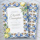 Besteht aus kursiver Schrift und Serifentypografie auf grünen grünen Blattpflanzen Botanicals; Alle vor einem Hintergrund von weißen, gelben und blauen mediterranen spanischen Fliesen mit Aquarellgelb Zitronen. Dies ist eine Vintage Feier des Lebens, der Beerdigung oder der Gedenkveranstaltung. Dieses wurde von White Oak Memorials entworfen, exklusiv für Zazzle. Abrufbar unter: http://www.zazzle.com/store/whiteoakmemorials