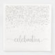 Papier Dinner Serviette mit silber Glitzer und den Text "Feiern". Der Text ist in einem Skript mit einer wirbelnden Glyphe am Anfang und Ende. Diese Serviette ist vielseitig und kann für viele Gelegenheiten wie Neujahr, Geburtstag, Jubiläum und andere verwendet werden. Es ist einfach, dieses monochrome Design mit anderen Dekorationen und Effekten in Silber und Weiß zu verbinden.