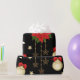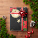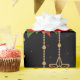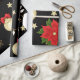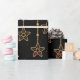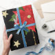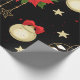 Eine Rolle Papier mit schwarzem Hintergrund und einem Muster aus goldenen Sternen und roten Sternen. Die goldenen Sterne haben verschiedene Größen und Formen, einige sind umrissen und andere solide. Die roten Sterne sind klein und verstreut im Hintergrund. Das Packpapier wird am unteren Bildrand aufgerollt und zeigt das graue Papier an der Innenseite an.