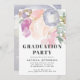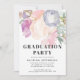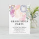 Eine sanfte feminine, moderne Graduiertenparty mit einem großen Strauß an Aquarellfarben-Blume in Pastellrosa, Blau und lila. Die Phrase "Graduierungsparty" ist in fett serf dunkelgrauem Schriftart. Personalisieren Sie mit dem Namen des Graduates und Veranstaltungsdetails im unteren Drittel der Einladung. Auf der Rückseite der Einladung befindet sich eine blaue Aquarellwäsche.