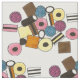 Die Stoffe sind mit einer Handvoll pastellfarbener Lakritze dekoriert, die auf weißem Hintergrund bedruckt sind. Erstellt aus einer originalen Marker-Abbildung.