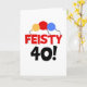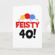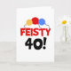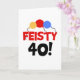 Drei primäre Farben Ballons und Schwarz und Text, die "Feisty 40" auf humorvollen 40. Geburtstagskarten, T - Shirt, Tasse und mehr lesen.