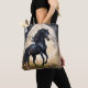 Vor einem Vollmond auf einem Feld der Blume abgebildet ist eine Pferdezucht.