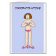 Une dame de bande dessinée debout dans des culottes roses et des chaussures roses avec ses mains couvrant la moitié supérieure de son corps. L'image a un arrière - plan bleu pastel et le mot 'Félicitations' au-dessus de l'image.