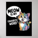 Diese bezaubernde Grafik zeigt eine glückliche Cartoon-Katze mit einzigartigen farbgeblockten Fellen in Blau, Orange, Gelb und lila Tönen, die eine festliche polka-gepunktete Bugs-Krawatte und eine winzige Glocke zeigt. Eine Sprechblase neben den Staaten "MEOW IST MEIN LIEBLINGSWORT", mit der Erholung des Textes "LIEBLINGSWORT", wird unten mutig angezeigt. Das Design ist Set auf einem soliden schwarzen Hintergrund. Digitaler Download nur für den persönlichen Gebrauch.