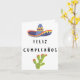 Spanische Geburtstagskarte (tarjeta de cumpleaños) mit Geburtstagsbotschaft auf Spanisch (Feliz Cumpleaños, Geburtstag auf Spanisch) und traditionell mexikanisch anmutende Illustration von Sombrero und Kakteen. Beinhaltet die Geburtstagsnachricht in der Karte 'Feliz Cumpleaños'.