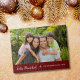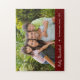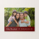 Feliz Navidad Spanisches Weihnachtspuzzle Red Trim Jigsaw, mit einer modernen Familie und Schrift Typografie Design. Mit weißen, anpassbaren Buchstaben fügen Sie Ihren eigenen Text hinzu. Sie ersetzen das Foto auch durch Ihr eigenes Bild. Eine festliche und persönliche Art Weihnachten mit der Familie zu feiern.