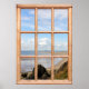 Der sanfte Ozean in dieser beruhigenden Fensterlandschaft kurveniert sich zu einem Strand mit weichem, goldfarbenem Sand. Im Vordergrund sind Felsen und Gras, und der Himmel oben ist blau mit weißen Kumulus und Stratus Wolken. Es handelt sich um einen sehr friedlichen Meerblick, der von einem Fenster aus einem warmen Holz gerahmt wird und einen überwältigenden Blick auf die Imitate auf jeder Wand in Ihrer Zuhause bietet.