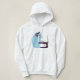 A hoodie with a cute female blue monster wearing a pink glowing headset standing at a desk with a desktop, typing. Concept of coding, programming, gaming and girls in tech.