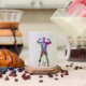 Artistic watercolor silhouette of a female soccer player printed on a ceramic coffee mug. A colorful and energetic sports design that adds creativity to your morning routine.