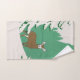 Cette serviette à main pour votre salle de bain a un cerf de femme marron avec un visage blanc debout à côté d'un pin sur un terrain recouvert de neige sur un arrière - plan vert menthe.