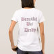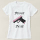 Die T - Shirts der Frau in vielen Arten und in Größen. Femme Fatale auf der Front mit dem rosa und schwarzen Gewehr schön aber tot an hinter