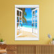 Blue Sea Trompe L'oeil Picture mit Blick auf den Strand von Fake. Optische Täuschung des Fotos mit offenem Fenster und schönem Blick auf das tropische Meer.