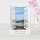 Offenes weißes Fenster mit schlichten Vorhängen und Blick auf den See zum Beileid. Alle Texte können geändert werden.