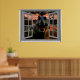 Sonnenuntergang mit T-rex Dinosaurier, Fake Fensterszene, für eine fensterlose Bürowand. Spaß, realistische optische Täuschung landschaftliches Poster für ein Büro oder eine Studiowand.