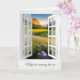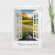 Offenes weißes Fenster mit schieren Vorhängen, Bergkulisse mit lila Wildblumen für das allgemeine Beileid. Alle Texte können geändert werden.