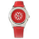 Kinderuhr mit rotem Gesicht und rotem Gurt mit einem Urlaubssnowflakprint gezeigt. Passen Sie diese Uhr an oder kaufen Sie, wie es ist.